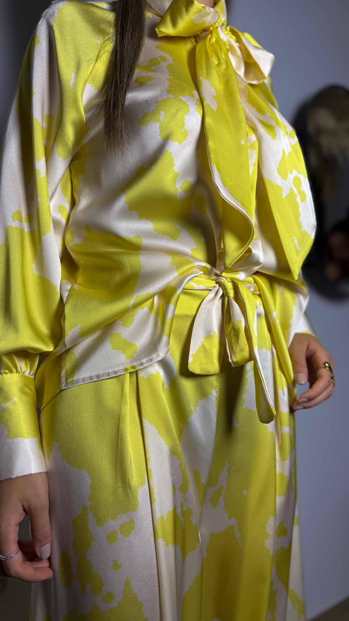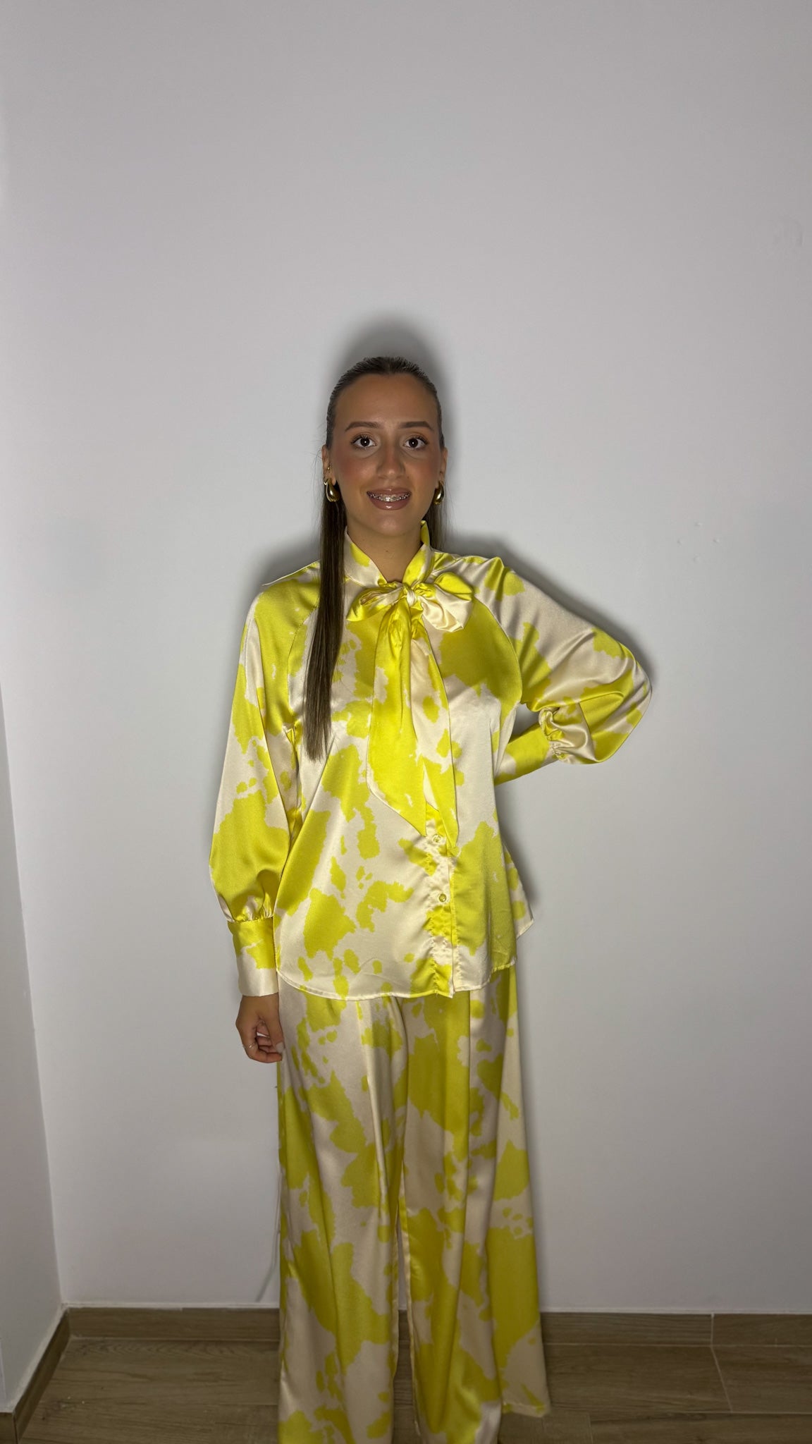-Camisa con detalla de lazada y pantalón palazzo.