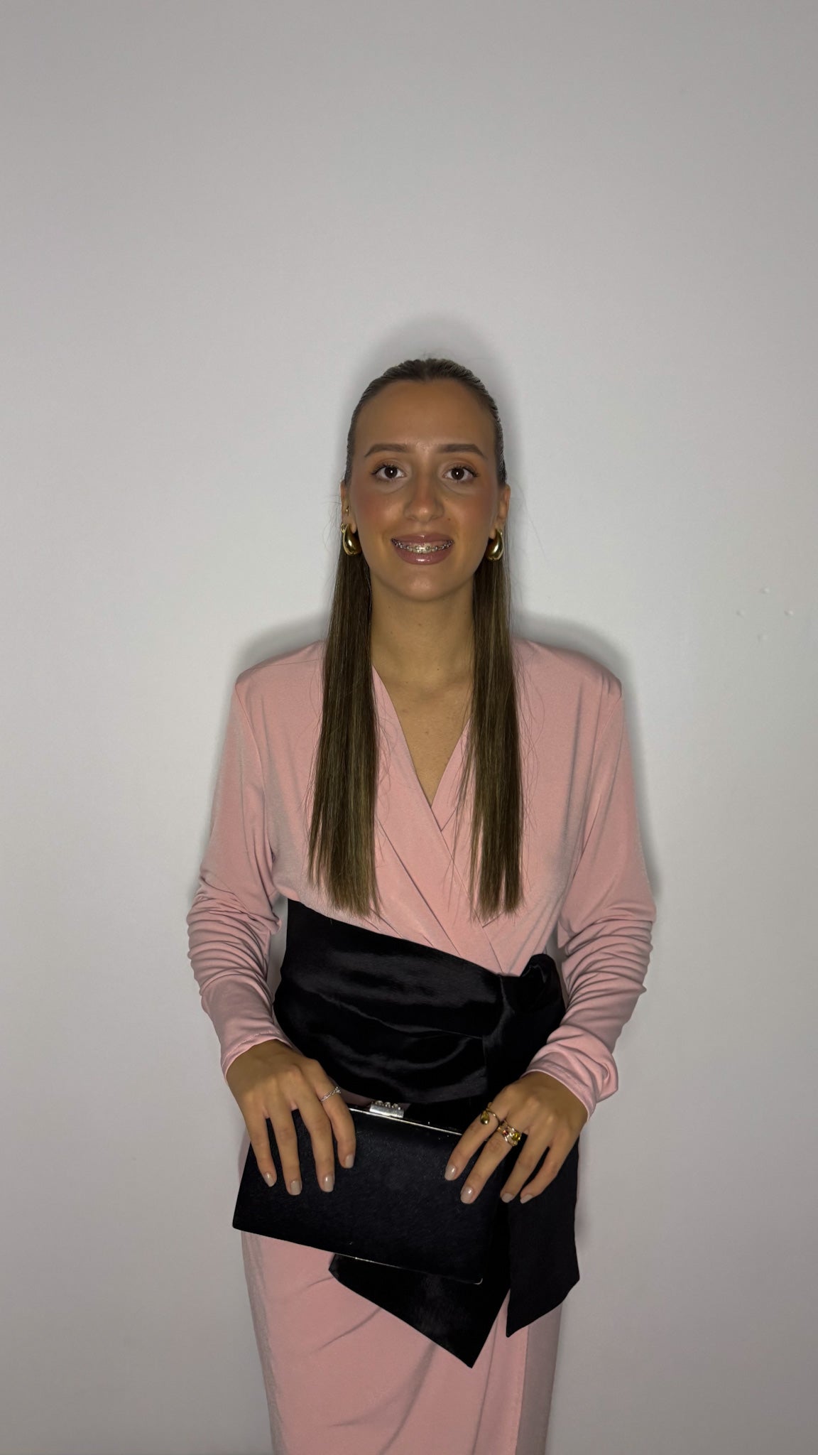 -Vestido rosa palo con fajín negro.